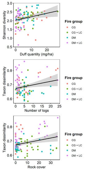 Relationships of taxon diversity to duff quantity (mg/ha) (top-panel) and of taxon dissimilarity among arthropod samples to the number of logs and rock cover (middle and bottom panels, respectively) at sample locations across fire groups. Symbol colors indicate the different fire groups, and shading around the line of fit indicates the 95% confidence intervals.