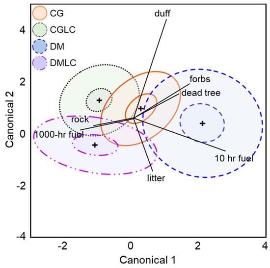 Understory environmental and vegetation factors have been shown to affect ground-dwelling arthropods in both unburned [75,76,77,78] and burned landscapes [12,79]. However, post-fire understory characteristics have also been reported to exert a minimal influence on ground-dwelling arthropod communities in some locations [80]. Despite explaining a maximum of 50% of variation in the ground-dwelling arthropod community structure (a result of the FSO) and lesser amounts of Shannon diversity and taxon dissimilarity (Figure 1), understory characteristics were important factors for differentiating the fire groups (Figure 2). A best-fit quadratic discriminant analysis model (QDA) correctly classified 84% of trapping sites to fire group based on a set of seven variables: cover of rocks and forbs, number of dead trees, and quantities of duff, litter, and 1000-h and 10-h fuels. By fire group, the QDA correctly classified 85% of CG, 77% of CG + LC, and 88% of both DM and DM + LC.