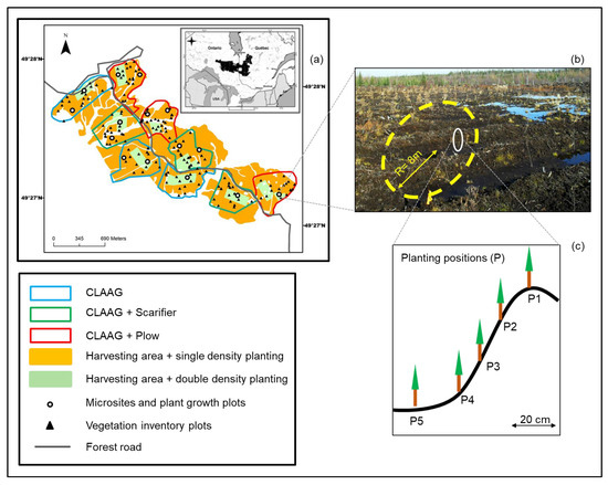 (a) Location of the study area (inset), distribution of the silvicultural treatments (careful logging around advance growth (CLAAG) without mechanical site preparation (MSP), CLAAG + scarifier, CLAAG + plowing), distribution of microsite and plant growth plots, and vegetation plots over the nine main cut block, and planting densities single (2200 stem per ha) and double (5000 stem per ha); (b) An inventory plot 8 m in radius; (c) Planting positions along a furrow (P1 higher to P5 lower) after mechanical site preparation.