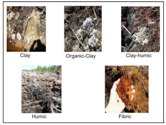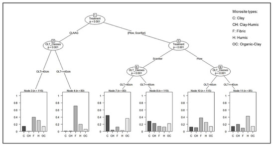 We identified five main types of microsite (Figure 2): clay, organic-clay mixture, clay-humic mixture, fibric and humic [6,48]. The regression tree analysis (Figure 3) shows that the availability of these microsites varied with the treatment and the post-CLAAG OLT class (≤40 cm vs. >40 cm). The “treatment” variable splits along a left branch (CLAAG) and a right branch (plow-scarifier), leading to two significantly different daughter nodes. The post-CLAAG OLT node then splits into two significantly different terminal nodes: where the OLT was less than 40 cm, the distribution of microsite types varied significantly with the treatment (p ≤ 0.05). CLAAG treatment without MSP resulted in 70% fibric microsites, followed by 20% humic microsites, while organic-clay microsites failed to exceed 10%, and clay and clay-humic microsites were hardly exposed at all (<1%). With the scarifier treatment, about 30% of the microsites exposed were clay, followed by clay-humic (about 25%) and organic-clay (about 20%). Fibric and humic microsites had the lowest percentages (about 15% and 10% respectively) on scarified plots. As for the plow, it exposed more humic microsites (40%) than other types, followed by clay-humic (20%), clay (~15%), organic-clay (~15%) and fibric (10%).