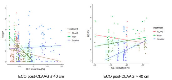 Where post-CLAAG OLT was low to moderate (≤40 cm), CLAAG without MSP yielded lower RGRV than the other two treatments, only if the percent reduction in OLT was under −20%. Above that threshold, growth in the CLAAG treatment decreased gradually as OLT increased (Figure 4). With the plow, seedling growth increased as the percent reduction in OLT increased (i.e., lower OLT). The opposite was observed with the scarifier: seedling growth increased as the percent reduction in OLT decreased (i.e., organic matter accumulation). Nevertheless, seedling growth was better with the plow than with the scarifier when OLT was reduced.