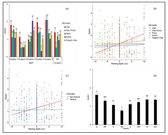 (a) Differences in relative growth rate in volume index (RGRV) by microsite type and planting position (see Figure 1c for a description of the planting positions). NP (No-Positions) indicates no planting position due to lack of furrow. (b) Effect of microsite type on the RGRV of seedlings by planting depth (p = 0.047). (c) Significant linear relationship (p = 0.042) among RGRV, seedling verticality and planting depth. (d) Differences in RGRV by aspect. Bars topped by the same letter are not statistically different (p ≥ 0.05). CLAAG: careful logging around advance growth. 3.3. Path analysis and correlations among variables influencing growth.