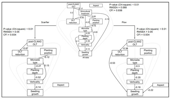Path analysis summarizing the direct and indirect correlations influencing seedling growth, as expressed by their relative growth rate in volume index. The analysis was performed for all of the data combined and for the scarifier (left) and plow (right) separately. The variables included account for 50% of the variability. Darker arrows indicate significant correlations. The number beside each arrow is the coefficient representing the influence of each correlation. The parameters used to fit the models were the Root Mean Square Error of Approximation (RMSEA) and the Comparative Fit Index (CFI). OLT: organic layer thickness; CLAAG: careful logging around advance growth.