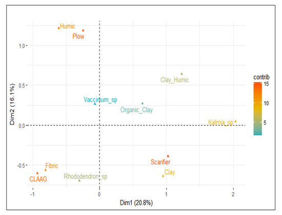 The first two axes of the multiple correspondence analysis (Figure 7) explained 36.9% of the variability in the data. Vaccinium species were closely associated with conditions created by the plow and humic microsites, but showed little association with clay microsites. Rhododendron was associated more with CLAAG without MSP, and with fibric microsites; they were scarce on organic-clay and clay-humic microsites. Kalmia was associated with the MSP-treated plots, in particular those that had been scarified, as well as with organic-clay and clay-humic microsites. Kalmia was less associated with CLAAG without MSP and with fibric microsites. Lastly, none of the Ericaceae species were closely associated with the clay microsites, a large proportion of which were exposed by the scarifier (Figure 7).