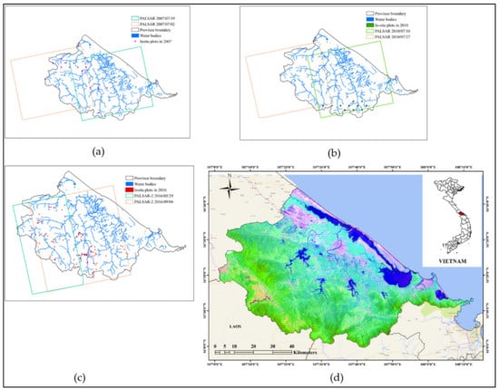 We used time-series SAR data and Landsat data acquired in 2007, 2010, and 2016 (Figure 1a,b,c). Two scenes of SAR data were collected per year, which were then used to create a mosaic covering 77% of the study area. The SAR data differed in term of acquisition mode, which led to a difference in the incidence angle and the size of the range and azimuth. Therefore, preprocessing was necessary to synchronize these data. Two polarization HH (horizontal transmitting, horizontal receiving) and HV (horizontal transmitting, vertical receiving) were used to process the data in this study. Landsat data were also selected to combine with SAR data for forest type classification. Landsat data were provided by the United States Geological Survey (USGS) with moderate resolution and wide spectral coverage. The swath width of Landsat is 185 km; therefore, it could cover the full study area. The characteristics of these data are described in Table 1.