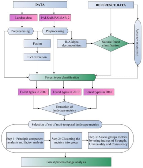In summary, there are two main objectives in this study. The first objective is to assess the potential of a semi-supervised model to classify natural forest types by using multi-source remote sensing data. The second objective is to assess the process of forest transition from the perspective of landscape ecology by using multi-temporal data.