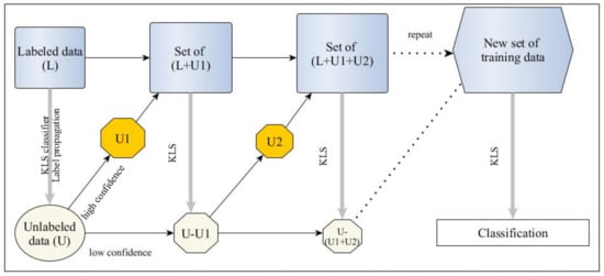 In this study, a self-learning algorithm was used to turn the KLS classifier into a semi-supervised model to solve the problem of the small amount of labeled data. Based on the training data, KLS was applied to assign labels to unlabeled objects, which were then added to the set of labeled objects for classification. There is a given set of labeled data (L) and a set of unlabeled data (U) (Figure 3). By applying a KLS classifier, k number of labels are assigned to unlabeled data. The result of predicted data U then joins with L to create a new training set for classifying the entire segmented images. In this study, we classified the forest into four classes: rich forest, medium forest, poor forest, and restoration forest. The features of the four classes were extracted from Landsat bands reflectance, EVI, HH, HV signals, covariance elements, and H/A/Alpha decomposition.