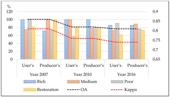 Overall, the classification accuracies were relatively high for 2007 with a kappa of 0.81 and OA of 0.86, respectively (Figure 4), while they were adequate for 2010 and 2016 with kappas of 0.76 and 0.74, respectively. The accuracies are generally the best for the rich forest over the entire time, with a user’s accuracy of 100% in the years 2007 and 2010, and of 85.71% in 2016. This is followed by medium forest with over 75% in both user’s and producer’s accuracies, although sometimes it was misclassified as rich or poor forest. On the other hand, the classification accuracies were the lowest in 2010 for poor forest and in 2016 for restoration forest. The confusion matrix in 2010 and 2016 reveals a significant confusion between the poor and restoration forests, and they therefore cause the values of OA and kappa to be reduced at these times (Appendix D).