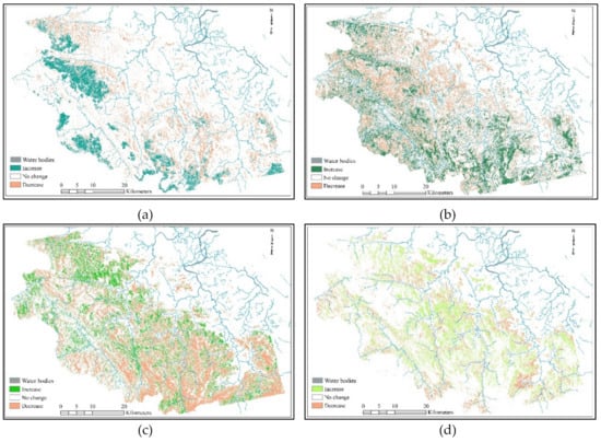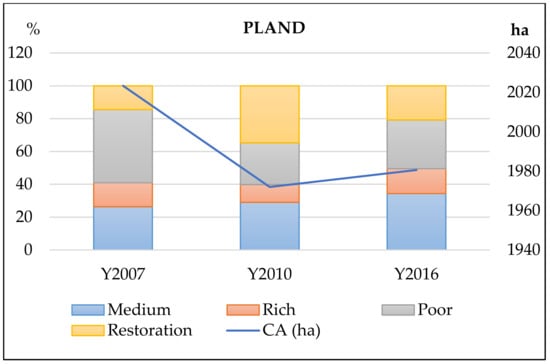 In the period 2007–2010, CA decreased quickly with an average loss of 1713 ha per year. However, in the period 2010–2016, signs of recovery in CA appeared with an average gain of 144 ha each year. From 2007 to 2016, rich, medium, and restoration forests mainly demonstrated an increase, as shown by the gain of PLAND 1–8%, while PLAND showed reductions for poor forest of up to –15%. Furthermore, to assess the spatial variation of forest patterns, a set of parameters, comprising 11 metrics at the class level and 15 metrics at the landscape level, was selected based on evaluation of the indicators for universality, strength, and consistency. The selection method was based on factor analysis, clustering, and evaluation for the four different forest types at three different time points. Therefore, this set of metrics ensures the appropriateness and representativeness of forest structure analysis over time for this test site. The changes in each forest type, based on analyzing landscape metrics from 2007 to 2016, are shown in Table 4.