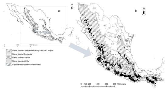(a) Mexican territory with the five “sierras”. (b) Native distribution of Pinus greggi Engelm. ex Parl. (black dots), P. oocarpa Schiede ex Schltdl. (black crosses), P. patula Schiede ex Schltdl. & Cham. (unfilled diamonds) and P. pseudostrobus Lindl. (grey squares) in Mexico modified from the NFLI (see Material and Methods), and germplasm transfer zones (contour grey solid lines [29]. Striped germplasm transfer zones are indicative of the presence of at least one of the four pine species.