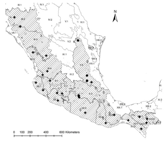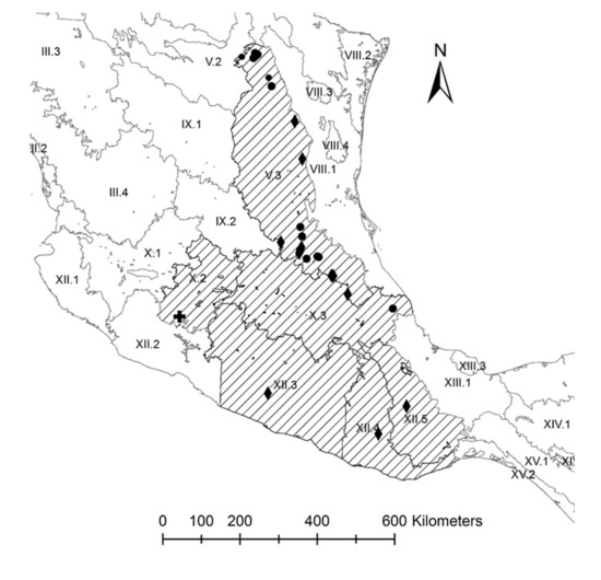 Populations and their genetic zones (striped polygons) considered as the most suitable source for providing forest reproductive material. Pinus greggi (black dots), P. oocarpa (black crosses) and P. patula (black diamonds).