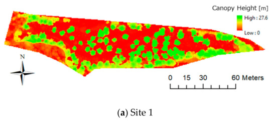 Figure 7 shows the estimated CHM produced by calculating the difference between the DSM and DTM according to Equation (1) and based on the 3D point cloud data created in Section 3.2.1. At both sites, the crown boundary was clearly detected in areas of low stand density, but the crown boundary tended to be unclear in high density areas. In the western part of Site 1 in Figure 7a, the forest density was high because thinning had not been performed due to topographical constraints. Therefore, the DTM could not be accurately estimated, and this affected the accuracy of the estimation of CHM. At Site 2 in Figure 7b, tree height was also overestimated in the southwest region compared to that actually measured despite the smoothing of the DTM. This error may have occurred because the model estimated a shallow DTM slope in this area, while the actual slope in the southwest observed in the field survey was very steep.