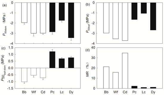 Hydraulic traits and mortality rate in six tree species. The abbreviation of functional traits is in Table 1. (a) P50stem; (b) P50leaf; (c) P50leaf-stem; (d) MR. The hollow and solid bars indicated the NS species and VS species, respectively. The codes of species: Bauhinia brachycarpa (Bb), Woodfordia fruticosa (Wf), Campylotropis delavayi (Cd), Polyalthia cerasoides (Pc), Lannea coromandelica (Lc), Diospyros yunnanensis (Dy).