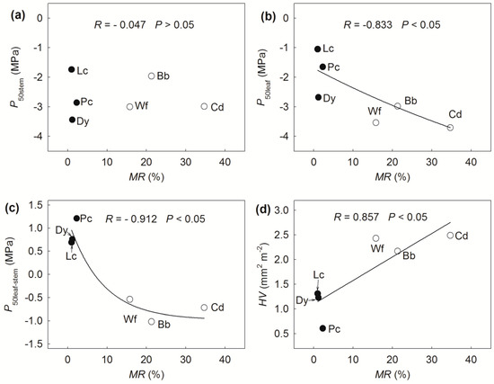Relationships between mortality rate and hydraulic traits in the six tree species. The abbreviation of functional traits and species codes as shown in Table 1 and Figure 1, respectively. (a) P50stem and MR; (b) P50leaf and MR; (c) P50leaf-stem and MR; (d) HV and MR. The hollow and solid circles indicate the NS species and VS species, respectively.