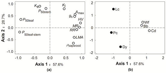 Principal component analysis (PCA) for twelve functional traits (a) and six tree species (b). The abbreviation of functional traits and species codes are shown in Table 1 and Figure 1, respectively. The hollow and solid circles in Figure 3b indicate the NS species and VS tree species, respectively.