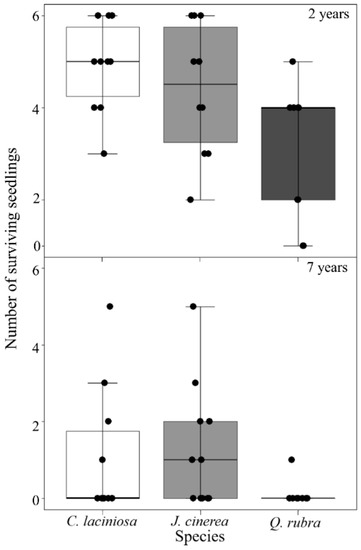 Survivorship of three species of tree seedlings (Carya laciniosa, Juglans cinereal, and Quercus rubra) planted in a temperate forest understory in southwestern Ohio, USA, during a forest restoration experiment. Seedlings were assessed after two and seven years and the maximum number of seedlings possible in each plot was six. The center of each box represents the median and each point represents the number of seedlings in each of ten plots.