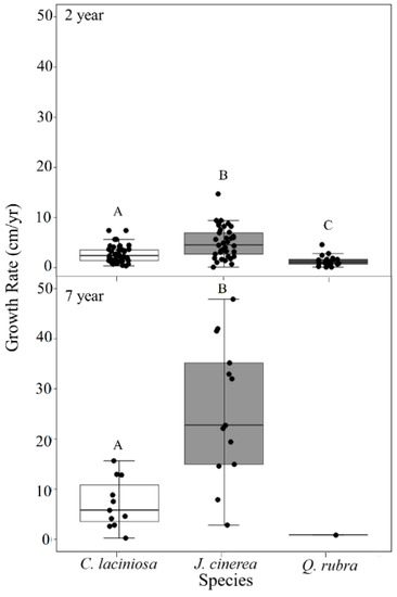 Height growth rate of three species of tree seedlings planted in a temperate forest understory in southwestern Ohio, USA, during a forest restoration experiment. The relative growth rates were calculated at two years and seven years by tree species. The middle bar in the box is the median, individual points represent seedlings, and letters indicate significant differences (p < 0.05).