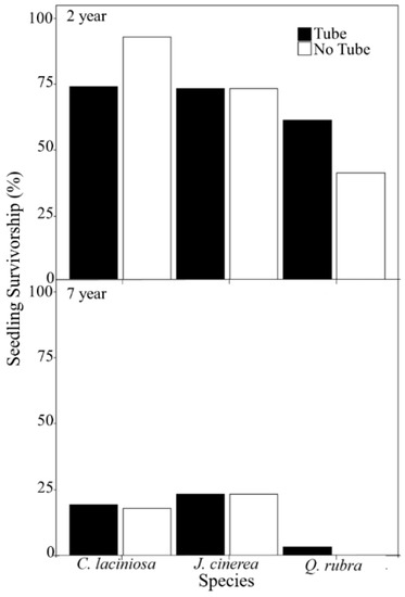 Percentage of seedling survival as a function of tree tubes for three species of tree seedlings planted in a temperate forest understory in southwestern Ohio, USA, during a forest restoration experiment. Seedlings planted without tubes are represented by white bars and trees planted with tubes are represented by black bars. There were no statistical differences among survivorship with or without tree tubes for C. laciniosa or J. cinerea (p > 0.05), but Q. rubra seedlings had higher survivorship with tree tubes after two years (p = 0.020).