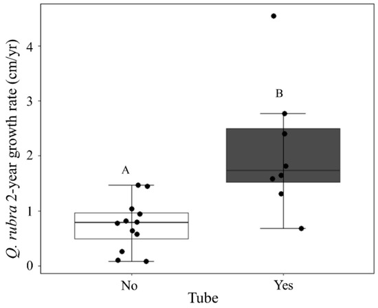 The growth rate of Q. rubra seedlings two years after planting by the use of tree tubes for seedlings planted in a temperate forest understory in southwestern Ohio, USA, during a forest restoration experiment. White indicates a lack of tree tube and dark grey indicates the use of tree tubes. Middle line in the box is the median, individual points represent seedlings, and letters represent statistically significant differences in the means (p = 0.002).