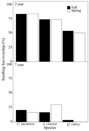 Percent survival of seedlings as a function of planting season for three tree species that were either planted in the fall (black) or the spring (white) in a temperate forest understory in southwestern Ohio, USA, during a forest restoration experiment. There were no statistically significant differences in survivorship among planting seasons for any species after 2 years of growth (p > 0.05) or for C. laciniosa or Q. rubra after 7 years (p > 0.05), but J. cinerea seedlings had higher survivorship when planted in the fall after 7 years of growth (p = 0.022).