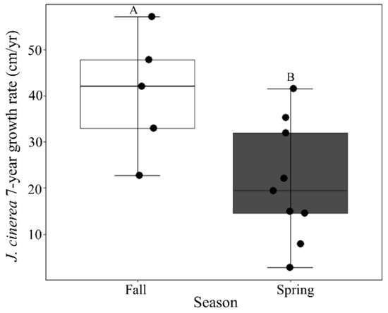 Growth rates of J. cinerea over seven years as measured in 2019 for seedlings planted in a temperate forest understory in southwestern Ohio, USA, during a forest restoration experiment. Seedlings that were planted in the fall are represented by white boxes and growth rates for those planted in spring are represented by the dark grey box. The middle line in the box is the median, individual points represent seedlings, and letters represent statistically significant differences between the means (p = 0.022).