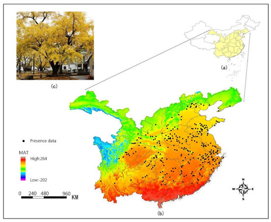 (a) Map of China; (b) distribution of the ginkgo presence points in major provinces and the different colors on the map reflect the changes of Mean Annual Temperature (MAT); and (c) Ginkgo biloba L.
