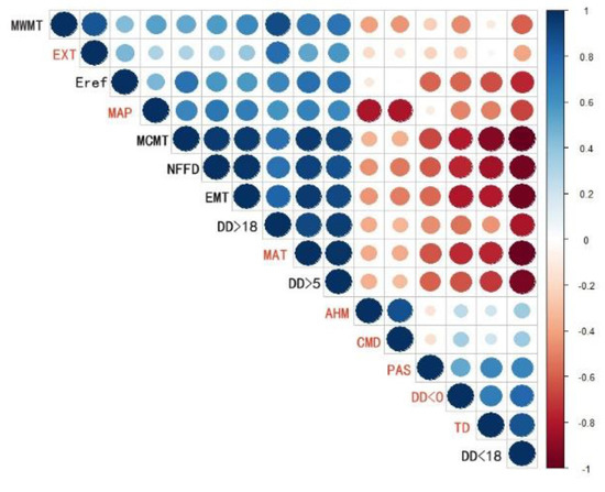 Pearson correlations of the 16 climate variables listed in Table 1. The blue circles are for positive correlations and the red ones for negative correlations. The stronger the correlation, the larger the size of the circle and the darker the color.