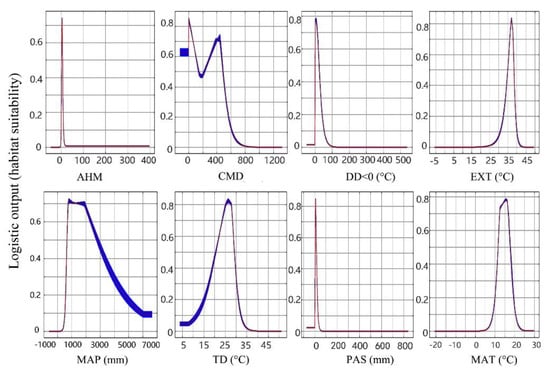 Response curves of the eight climate variables in the ginkgo bioclimatic model. The maximum entropy (MaxEnt) logistic output (also known as habitat suitability) is represented by the vertical Y-axis and the climate variable by the horizontal X-axis. When the logical output value is greater than 0.5, the probability of species presence under this climate condition is higher than that under a ‘typical’ condition, which indicates that the climate condition is suitable for tree species. The red curves shown are the averages over 10 replicate runs; blue margins show ±1 standard deviation (SD) calculated over 10 replicates.