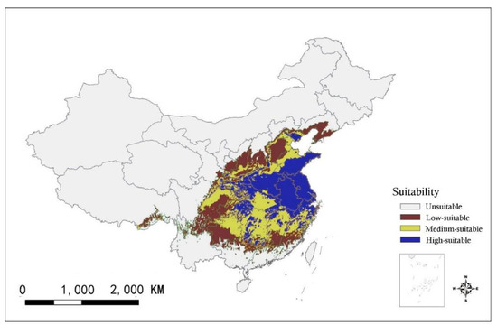 We used the maximum entropy approach to model the relationship between the species occurrence and climate variables. This approach performs well compared to many other bioclimatic models [43]. We used the MaxEnt 3.4.1 version and established the following settings in the software interface: check the Jackknife test; random test = 25%; regularization multiplier = 1; maximum background points = 10,000; and a repeat was run 10 times. We randomly divided the data into a training set (75%) for model development and a validation set (25%) to assess model performance. To consider the uncertainty introduced by splitting the training and validation sets, 10 models were built by 10 repeated runs for cross-validation. The remaining settings were kept as default. This setup has been considered to be reasonable and effective in a wide range of niche studies. MaxEnt assigns a non-negative probability to each pixel in the study area (probabilities sum to 1). To be easier to use and interpret, MaxEnt outputs the ‘cumulative’ probability for each pixel on the scale of 0%–100%. Therefore, the habitat suitability is classed by setting decision thresholds [28]. According to previous studies [27,44,45], we classified habitat suitability into four levels: (1) High-suitable habitat—probability values greater than 0.6; (2) medium-suitable habitat—values ranging from 0.4 to 0.6; (3) low-suitable habitat—values ranging from 0.1 to 0.4; and (4) unsuitable habitat—values less than 0.1.