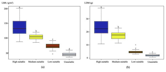 Differences in leaf-traits of ginkgo observed in the different suitable habitat categories (single-factor ANOVA). Box plots (a,b) show difference in leaf dry mass per unit area (LMA) (g/m2) and leaf dry mass per tree (LDM) (g) in four types of suitable habitat, respectively. Different letters indicate significant differences among mean values (p < 0.05).