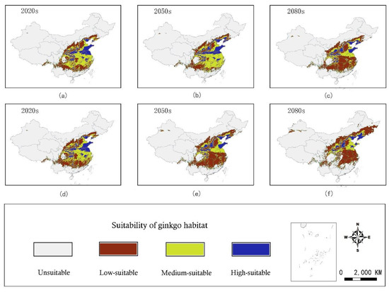 Maps of the habitat suitability of ginkgo in China in the 2020s, 2050s, and 2080s under the RCP4.5 (a–c) and the RCP 8.5 (d–f) emissions scenarios, respectively.
