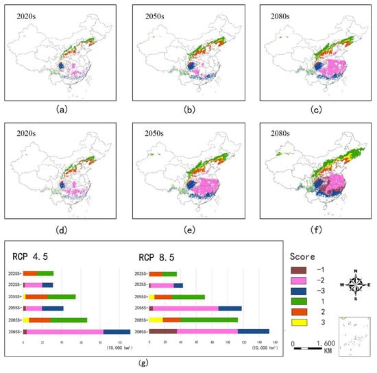 Area changes in different suitable habitats types of ginkgo relative to the current by the 2020s, 2050s, and 2080s under RCP4.5 (a–c) and RCP8.5 (d–f), respectively. (g) Summary table. −1 = low-suitable habitat becomes unsuitable habitat; −2 = medium -suitable and high-suitable habitat become low-suitable habitat; −3 = medium-suitable and high-suitable habitat become unsuitable habitat; 1 = unsuitable habitat become low-suitable habitat; 2 = low-suitable habitat become mid- suitable and high-suitable habitat; and 3 = unsuitable habitat become medium-suitable and high-suitable habitat.