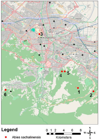 Across the city of Sapporo, 109 A. sachalinensis individual trees were chosen for data sampling at six sites along a gradient from the city center to the suburbs of Sapporo and a forest area outside of the city (Figure 3).