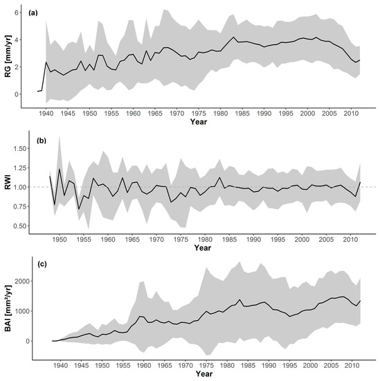 Radius growth, RG (a), indexed growth values, ring-width indices (RWI) (b), and basal area increments, BAI (c), of all sampled A. sachalinensis trees in Sapporo.