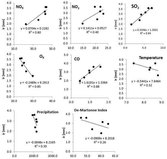 Relationships of mean environmental pollution (NOX, NO2, SO2, OX, CO) and mean climate data (temperature, precipitation, de Martonne-Index) with average radial growth of A. sachalinensis in Sapporo, Japan in five-year time steps from 1983 to 2012 and an added regression line with regression coefficients and adjusted R2..