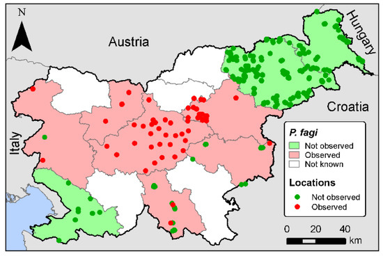 The first symptoms of P. fagi on European beech in Slovenia were observed in August 2018 in Kamniška Bela (46.32020° N, 14.60161° E) and in Ljubljana (46.05195° N, 14.47859° E). Both sites were located near streams in mixed managed forests and were characterized by high humidity. With the help of foresters from the Slovenia Forest Service, the disease was confirmed to be present in a large part of Slovenia (Figure 1).