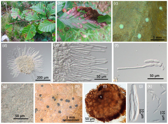 Symptoms and morphology of Pseudodidymella fagi: (a,b) Necrotic leaf spots; (c) necrotic leaf spot covered with mycopappus-like propagules; (d) macroscopic view of mycopappus-like propagule, conidium; (e) septate appendages; (f) basal cells of an appendage; (g) globular cells in the central part of a propagule; (h) ascomata on upper leaf surface; (i) ostiole of an ascoma; (j) asci; (k) ascospores.
