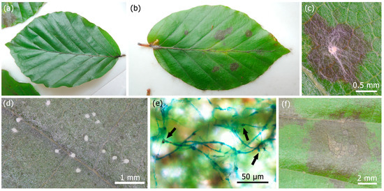 Symptomatic leaves were examined, photo-documented, and analyzed with an Olympus SZX16 stereomicroscope (Tokyo, Japan) with an Olympus UC90 camera (Münster, Germany), an Olympus BX53 microscope (Tokyo, Japan) with an Olympus DP26 camera (Tokyo, Japan), and an Olympus CellSens Standard v1.18 software.