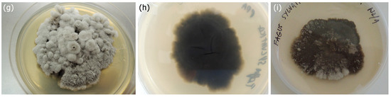 Pathogenicity test on Fagus sylvatica: (a) Control on the 21st day; (b) necrotic leaf spots on the 21st day; (c) a lesion developed under a propagule on the 2nd day; (d) fresh mycopappus-like propagules developed on a necrotic spot on the 14th day; (e) appressorium formation (arrows) on the 11th day; (f) disintegration of the inoculated propagule on the 21st day; (g,h) upper and reverse side of culture re-isolated from newly formed mycopappus-like propagule on PDA, respectively; (i) re-isolation from newly formed mycopappus-like propagule on MEA.