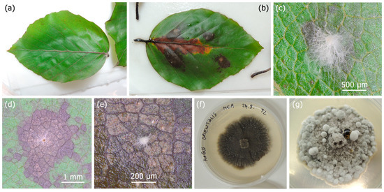 Pathogenicity test on Fagus orientalis: (a) Control on the 21st day; (b) necrotic leaf spots on the 21st day; (c) a lesion developed under a propagule on the 2nd day; (d) lesion under a propagule on the 11th day; (e) newly formed mycopappus-like propagule on a necrotic spot on the 14th day; (f,g) re-isolation from newly formed mycopappus-like propagule on MEA and PDA, respectively.