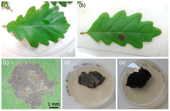 Pathogenicity test on Quercus petraea: (a) Control on the 21st day; (b) necrotic leaf spot on the 21st day; (c) disintegration of the inoculated propagule on the 21st day; (d,e) upper and reverse side of culture re-isolated from necrotic leaf spot on MEA, respectively.