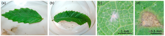 Pathogenicity test on Castanea sativa: (a) Control on the 21st day; (b) inoculated leaf on the 21st day; (c) germination of a propagule on the 2nd day; (d) necrotic leaf spot on the 21st day.