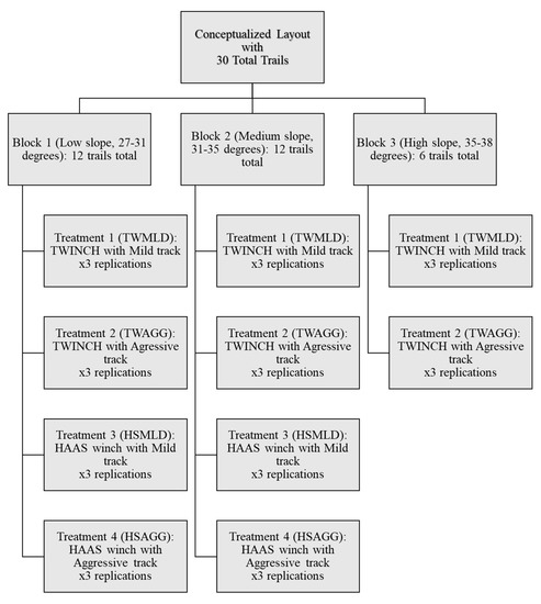 Our study employed a randomized incomplete block design with three blocks. The “low” slope class (27–31 degrees) constituted block 1, the “medium” slope class (31–35 degrees) constituted block 2, and the “high” slope class (35–38 degrees) constituted block 3. Each block represented a set of treatments, with each set of treatments being replicated 3 times. Blocks 1 and 2 had four treatments each. Treatment 1 (TWMLD) was the forwarder with the mild track tethered with the T-WINCH, Treatment 2 (TWAGG) was the forwarder with the aggressive track tethered with the T-WINCH, Treatment 3 (HSMLD) was the forwarder with the mild track tethered with the HAAS winch, and Treatment 4 (HSAGG) was the forwarder with the aggressive track tethered with the HAAS winch. For block 3, only TWMLD and TWAGG were conducted due to a recommended slope limit of 35 degrees for the HAAS winch. This resulted in 30 total forwarder trails: 12 trails each for blocks 1 and 2 (4 treatments per block replicated 3 times each) and 6 trails for block 3 (2 treatments replicated 3 times each) (Figure 4). Each of the 30 trails was split mid-slope, having 3 data collection points equally spaced on the upper slope and 3 data collection points equally spaced on the lower slope. This represented 2 different traffic levels: The upper slope was traversed more than the lower slope due to multiple loads being hauled from each trail (Figure 5). As a result, there were 60 total experimental units (30 trails × 2 traffic levels), and 180 data collection points (60 experimental units × 3 data collection points per experimental unit).