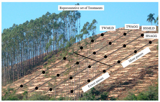Slope class was the main variable which caused significant differences in predicted erosion rates between treatments; an analysis of treatments within slope classes yielded no significant differences. Predicted weighted average erosion rates were high across all slope classes when compared with some operations, such as skyline cable logging [2], but they were similar to some bladed skid trail operations with lower slopes and shorter slope lengths [42]. Oliveira et al. evaluated soil, nutrient, and organic carbon losses caused by water erosion at different development stages of Eucalyptus using erosion plots and provided acceptable erosion rates of up to 12.9 Mg/ha/year in eucalyptus plantations in Brazil to maintain tree productivity and economic sustainability [83]. However, high predicted erosion rates were expected in the trails given the extreme slopes in this study.