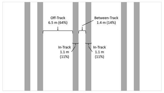To calculate potential erosion rates, the Universal Soil Loss Equation as modified for forests (USLE-Forest) was used [57]. Parameters for the USLE were collected at each of the three sampling locations for each point. The rainfall erosivity value (R) was determined using the average monthly rainfall and the equation provided for that general location in Brazil by Lombardi and Moldenhauer [58]. The soil erodibility value (K) was determined by a textural analysis technique provided by Dissmeyer and Foster [57]. The slope length (L) was measured using a measuring tape, and the slope steepness (S) was recorded with the slope gauge of the forwarder. The cover and management factor (C) and the support practice factor (P) was also determined using the guide provided by Dissmeyer and Foster [57]. Average trail spacing, track width, and trail width were calculated and used for a weighted average of the erosion rates to allow for an estimate more representative of the entire area (Figure 6). The change in predicted erosion was calculated by subtracting the off-track rate from the in-track rate. Rut depth was measured for the in-track location at each data collection point using a tape measure. Soil type was determined at each point using in-the-field textural analysis [59].