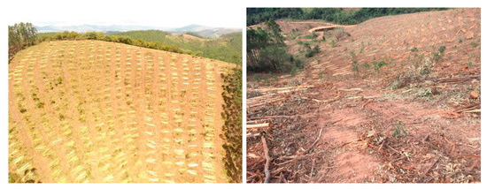 There are numerous variables which combine to explain these rates. Brazil’s rainfall erosivity (R) value ranges from 1672 to 22,452 MJ mm ha−1 h−1 yr−1 [84]. The rainfall erosivity value determined during this study was 6347.64 MJ mm ha−1 h−1 yr−1, which is below average for Brazil but is still relatively high compared with other non-tropical countries [33,57]. The soil erodibility (K) values also tended to increase with slope class, indicating more erodible soils on the steeper areas. The low slope class had a K value of 0.063 t h MJ−1 mm−1, the medium slope class had K values from 0.091 to 0.146 t h MJ−1 mm−1, and the high Slope class contained K values from 0.157 to 0.237 t h MJ−1 mm−1. The topographic factor (LS) is a function of slope steepness and slope length; thus, the observed LS values were high compared with other studies on more gentle terrain [85]. Our study areas were characterized by steep, long, continuous slopes. Slopes ranged from 27 to 38 degrees, while slope lengths varied from 5 to 90 m without breaks. This resulted in LS values ranging from 5.20 to 42.14. Given that these factors led to high predicted erosion rates, the cover and management factor (CP) was extremely important. The main value that varied between points within the CP factor was soil cover. The median CP value was 0.002, but there was a considerable amount of variability in this factor, with some points having CP values of up to 0.284. This lack of cover in places explains some of the high erosion rates and variability observed.