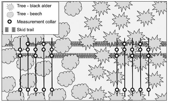 Sketch of the two adjacent stands of black alder and beech with an abandoned skid trail. Measurement collars were installed along five stratified transects per stand: undisturbed stand, wheel track and center bulge.