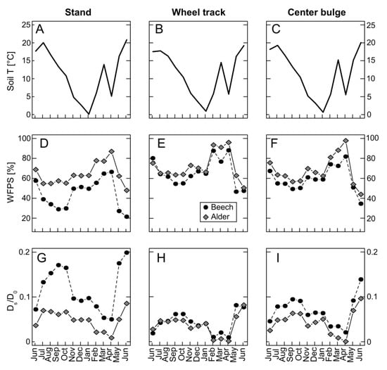 Monthly mean values of soil temperature (A–C), water filled pore space (WFPS; D–F), and Ds/D0 (G–I) during the measurement period between June 2016 and June 2017 in each stratum for beech and black alder.
