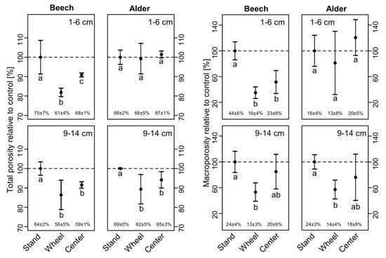 Relative changes of total porosity (left) and macro porosity (right) compared to the respective undisturbed stand (100%). Error bars indicate the ±95% confidence interval of medians. Significant differences between median values of strata within tree species are denoted by different letters. Absolute values as volume percent (median ±95% confidence interval) are given at the bottom of each bar.