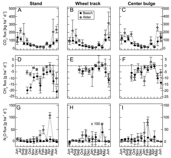 Monthly fluxes of CO2 (A–C), CH4 (D–F), and N2O (G–I) during the measurement period between June 2016 and June 2017 in each stratum for beech and black alder. Median values of five field replicates ±95% confidence intervals are shown.